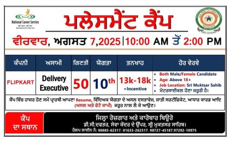 ਜਿਲ੍ਹਾ ਰੋਜ਼ਗਾਰ ਅਤੇ ਕਾਰੋਬਾਰ ਬਿਊਰੋ ਸ਼੍ਰੀ ਮੁਕਤਸਰ ਸਾਹਿਬ ਵਿਖੇ 07 ਅਗਸਤ 2025 ਦਿਨ ਵੀਰਵਾਰ ਨੂੰ ਪਲੇਸਮੈਂਟ ਕੈਂਪ ਲਗਾਇਆ ਜਾ ਰਿਹਾ ਹੈ। ਇਸ ਪਲੇਸਮੈਂਟ ਕੈਂਪ ਵਿੱਚ ਫਲਿੱਪਕਾਰਟ ਕੰਪਨੀ ਵੱਲੋਂ ਡਿਲੀਵਰੀ ਦੇ ਕੰਮ ਦੀਆਂ 50 ਅਸਾਮੀਆਂ ਲਈ ਇੰਟਰਵਿਊ ਲਈ ਜਾਣੀ ਹੈ।
