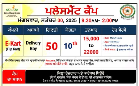 ਦਲਜੀਤ ਸਿੰਘ ਬਰਾੜ, ਪਲੇਸਮੈਂਟ ਅਫ਼ਸਰ ਵੱਲੋਂ ਜਾਣਕਾਰੀ ਦਿੰਦੇ ਹੋਏ ਦੱਸਿਆ ਕਿ ਜਿਲ੍ਹਾ ਰੋਜ਼ਗਾਰ ਅਤੇ ਕਾਰੋਬਾਰ ਬਿਊਰੋ ਸ਼੍ਰੀ ਮੁਕਤਸਰ ਸਾਹਿਬ ਵਿਖੇ 30 ਸਤੰਬਰ 2025 ਨੂੰ ਪਲੇਸਮੈਂਟ ਕੈਂਪ ਲਗਾਇਆ ਜਾ ਰਿਹਾ ਹੈ। ਉਨ੍ਹਾਂ ਦੱਸਿਆ ਕਿ ਇਸ ਪਲੇਸਮੈਂਟ ਕੈਂਪ ਵਿੱਚ ਈ.ਕਾਰਟ (ਫਲਿੱਪ ਕਾਰਟ) ਵੱਲੋਂ ਡਲੀਵਰੀ ਬੁਆਏ ਦੀਆਂ 50 ਅਸਾਮੀਆਂ ਲਈ ਇੰਟਰਵਿਊ ਲਈ ਜਾਣੀ ਹੈ।